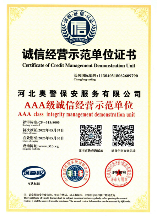 “忠誠(chéng)的伙伴,非凡的朋友”,河北奧警保安服務(wù)有限公司本著“客戶的需求就是我們的追求”的服務(wù)理念,與廣大客戶攜手并進(jìn)、共創(chuàng)恢弘偉業(yè)。